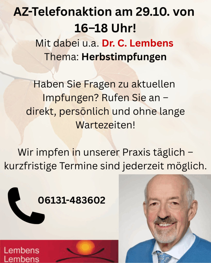 Am Donnerstag den 06.11. bleibt unsere Praxis von 14:00 Uhr bis 17:00 Uhr wegen eines internen Notfall-Trainings geschlossen. Wir sind an diesem Tag vormittags von 06:30 Uhr bis 13:00 Uhr und ab 17:00 Uhr wie gewohnt für Sie da. Vielen Dank für Ihr Verständnis!